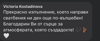 "Невероятен професионалист! Направи сватбата ни толкова красива с арфата и присъствието си и много ти благодарим,че внесе тази невероятна атмосфера!
